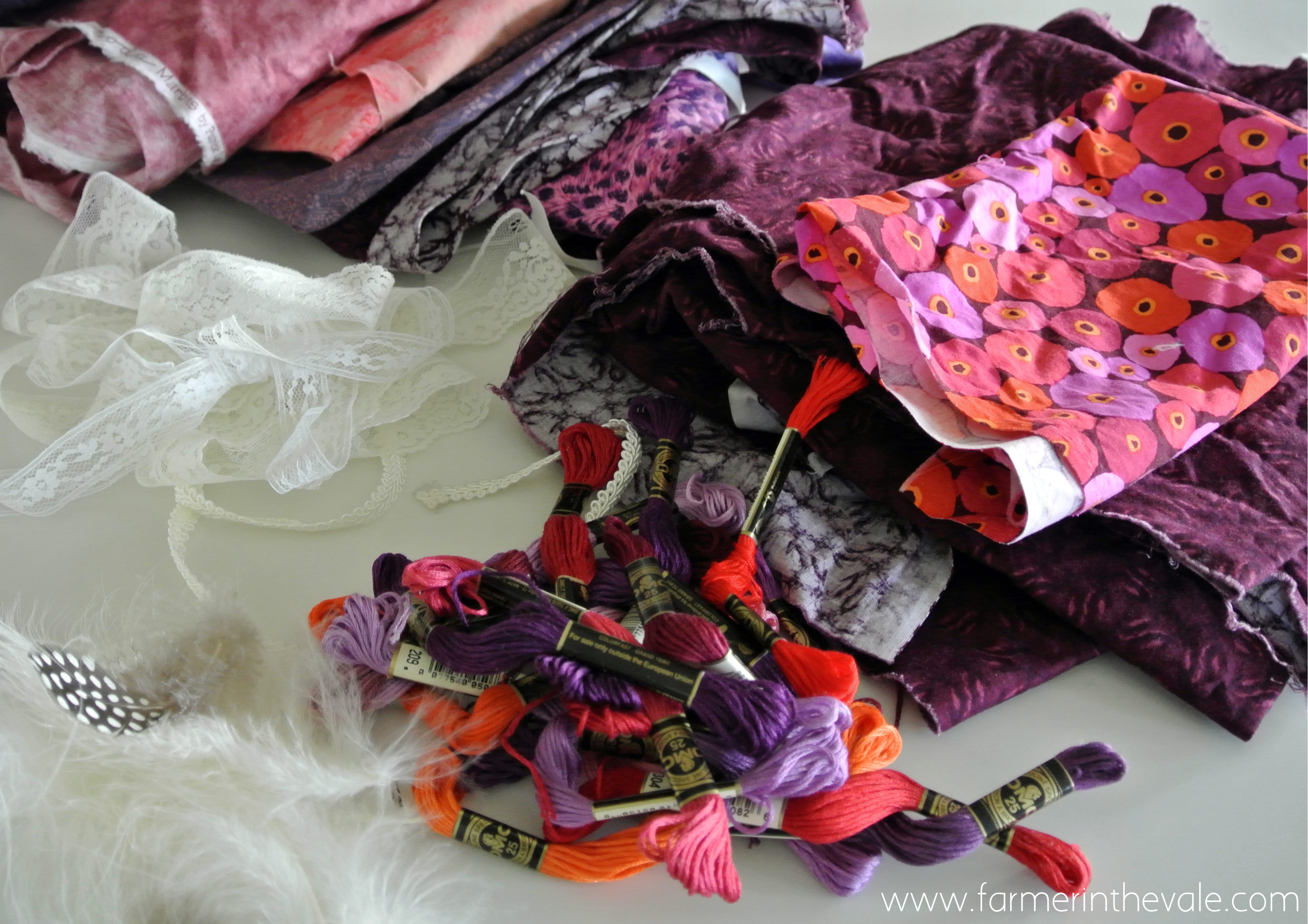 As always I started with fabrics. I thought pink and purple would be fun and I found this great poppy fabric in my stash. I also found a lot of embroidery threads that would work nicely.