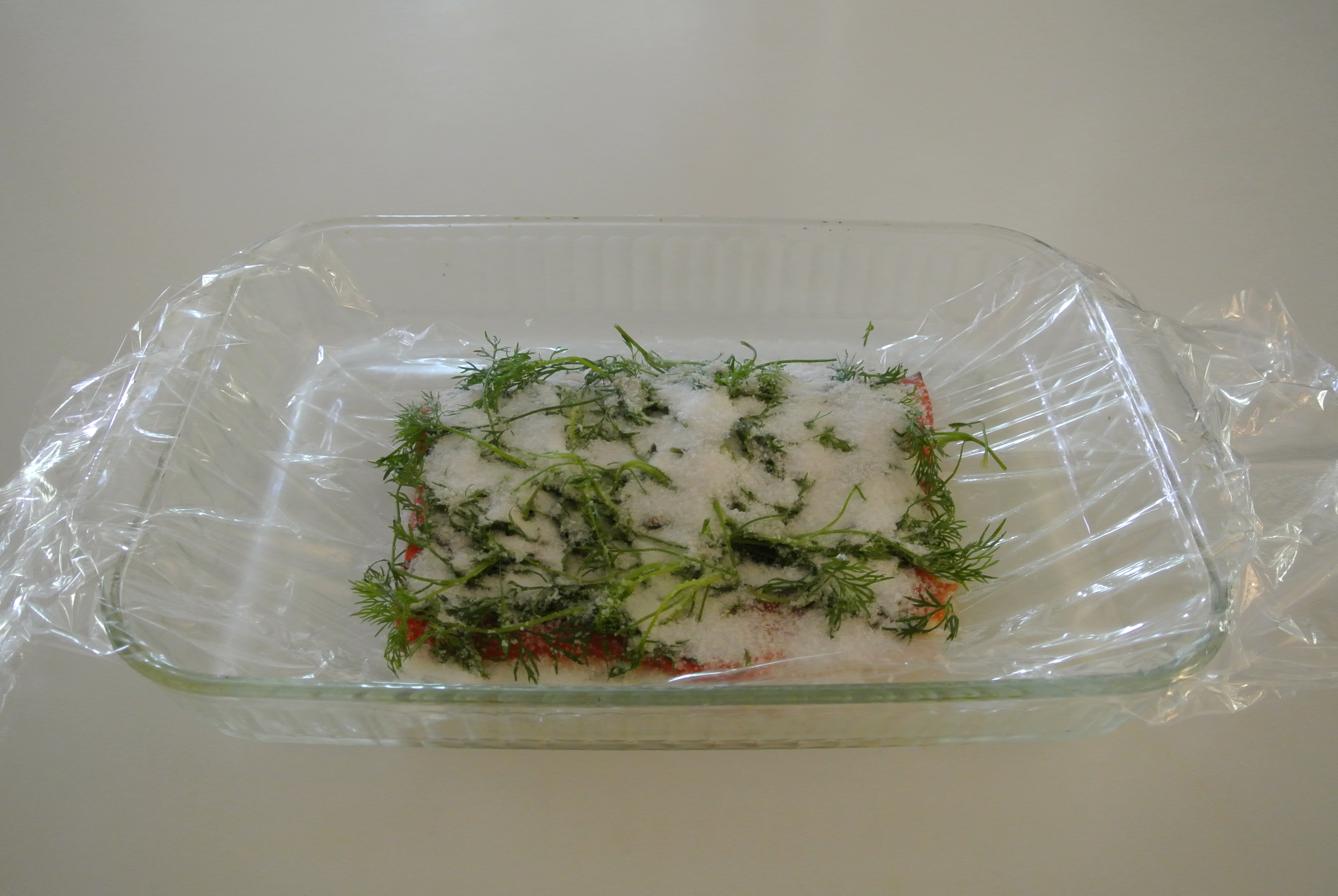 Place the entire bunch of fresh dill on top of the salmon. Combine the salt and sugar and pack the mixture on top of salmon and dill. If you are using dried dill, combine the dill with the salt and sugar before placing it on the salmon.