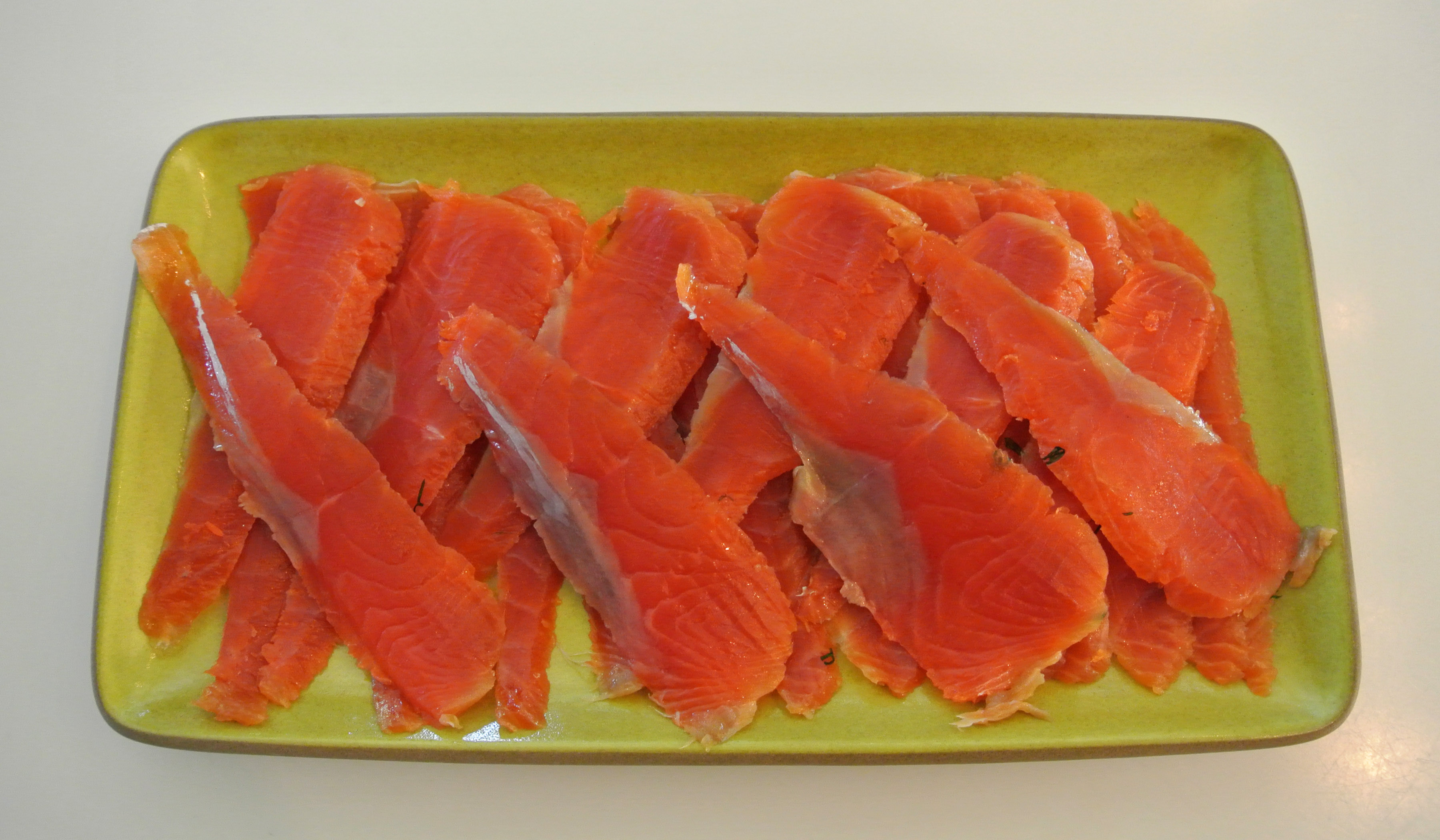 To serve, slice the salmon as thinly as you can. Serve with crackers and mustard cream cheese spread.